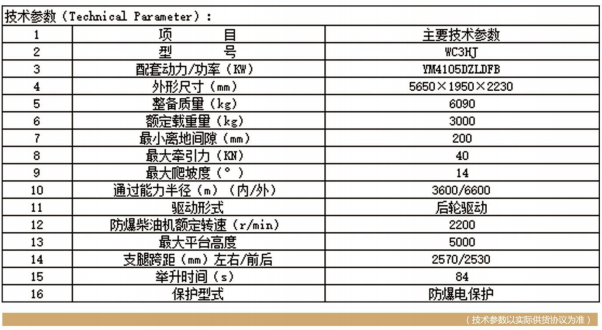 WC3HJ是我公司研制的新一代防爆 無軌膠輪車,配套YM4105DZLDFB防爆柴油機無軌膠輪車,防爆性能國內領先,適合于煤礦井下運輸和應急維修作業(yè),特別適合于井下運輸和爬坡需要,體積小,適合于小端面,窄巷道作業(yè)。主要技術參數(shù)