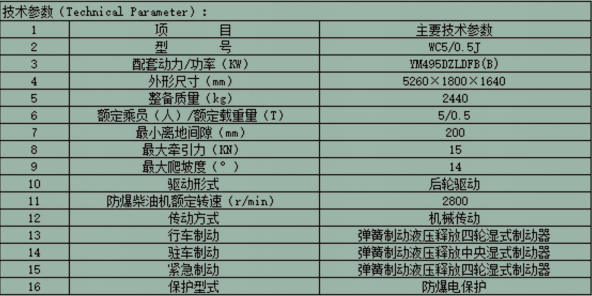 WC5/0.5J防爆柴油機(jī)無(wú)軌膠輪車是一種以防爆柴油機(jī)為動(dòng)力,機(jī)械傳動(dòng),四輪驅(qū)動(dòng)的煤礦井下無(wú)軌運(yùn)人機(jī)械,主要適用于巷道斷面不小于3×4米。坡度不大于15°,煤礦井下運(yùn)輸作業(yè)車,機(jī)車為皮卡箱式結(jié)構(gòu),具有結(jié)構(gòu)緊湊,操作方便,轉(zhuǎn)彎半徑小,爬坡能力強(qiáng),運(yùn)輸效率高等優(yōu)點(diǎn)。